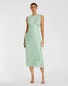 Chic sleeveless midi dress with rows of vertically-striped sequins throughout. Intricate, hand-beaded flowers adorn the bodice and skirt, and crystals accent the neckline and waist.